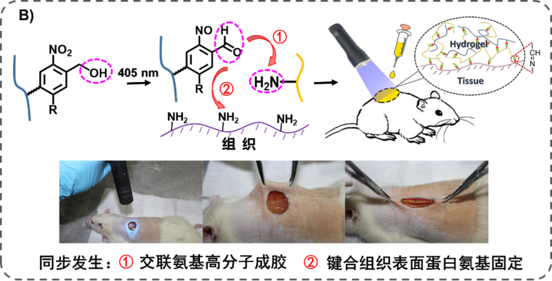 图A:提出“光偶联反应”非自由基交联机制 为进一步突破传统意义上“柔弱”“光滑”的水凝胶无法与潮湿、动态的组织表面粘附固定的挑战,朱麟勇研究团队提出发展能够与组织表面氨基共价键合的“光偶联反应”,建立了具有组织粘附与整合特性的光原位凝胶技术(Adv. Mater., 2016, 28, 2724; Adv. Funct. Mater., 2018, 28, 1706918)(见图B),技术一经发表就被“Global Medical Discovery”(全球医药发现)作为“Key Scientific Article”(重要的科学论文)加以报道。