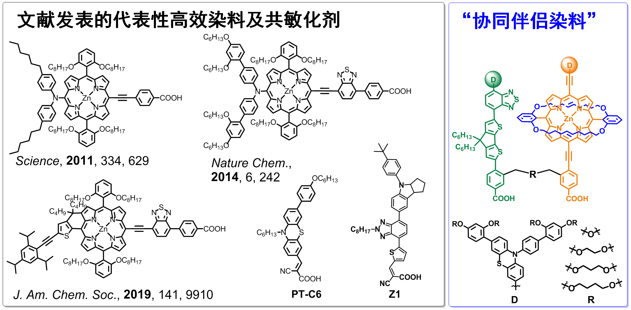 基于上述系列研究成果,解永树教授课题组近期应邀于 Energy & Environmental Science发表综述,全面介绍了卟啉类染料分子结构的系统优化、共吸附、共敏化及“协同伴侣”染料等最新研究进展,并对该领域有待进一步改进的问题、发展方向和发展前景进行了展望。