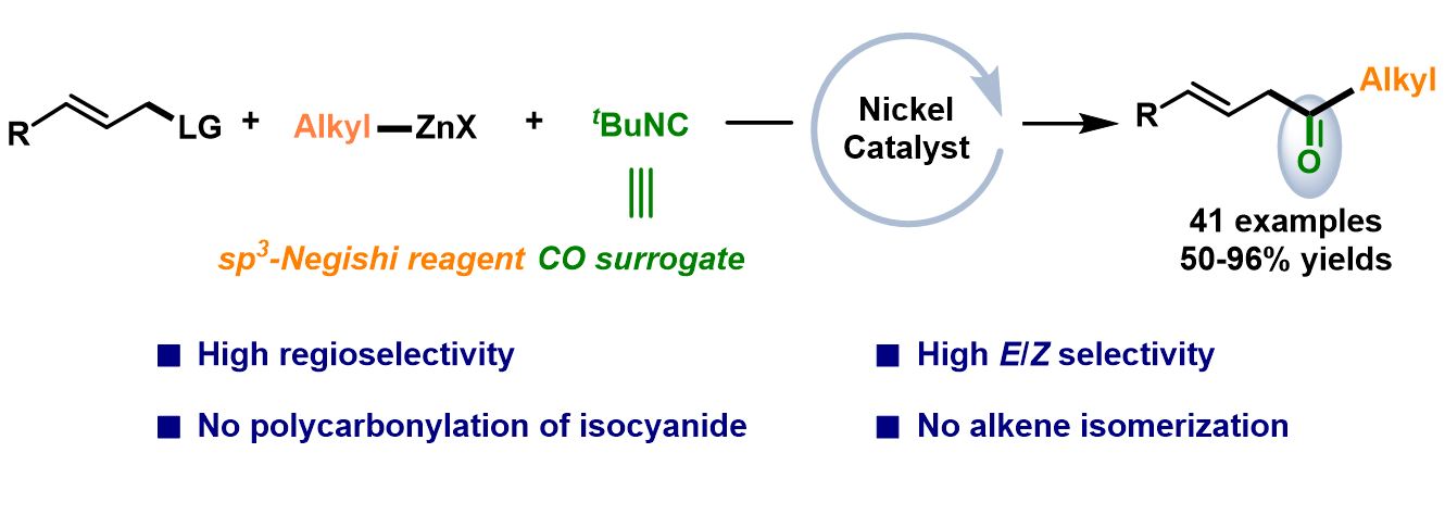在本工作中,研究者们利用异腈作为一氧化碳的等当体,易于修饰的有机锌试剂作为烷基碳亲核试剂,在温和条件下高选择性地实现了重要有机合成中间体b,g -不饱和酮的高效合成。廉价易得的镍催化剂的使用不仅克服了钯催化化学中常见的异腈过度插入的副反应,也解决了钯催化的烯丙基Negishi羰基化偶联区域、化学选择性较差等问题;与此同时,有机锌试剂的使用还避免了镍催化下异腈容易发生聚合的问题,实现有机小分子的精准合成。
