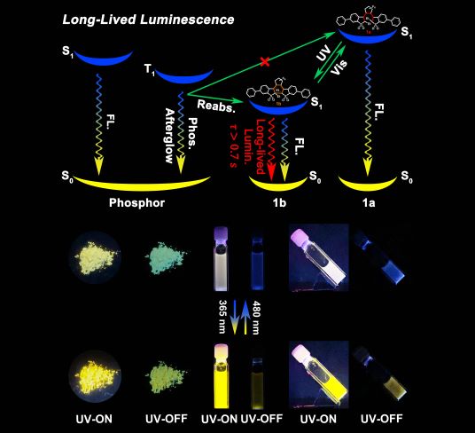 基于这一策略,研究团队采用不同的磷光材料做能量给体,配合具有光响应性的能量受体材料,成功实现了固态、溶液态和凝胶态等3种状态下不同颜色余晖的可逆调控,并通过系统地表征这些材料在不同状态下的发射光谱、发光寿命、激发光谱等数据,并设置相应的控制实验,成功证明了其辐射能量转移的机理。这一策略不仅具有较为简单的工作原理,还具备很强的通用性和可行性。