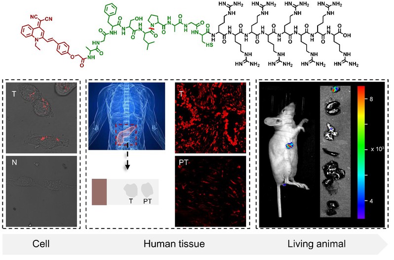 图片说明:双亲性AIE探针QM-HSP-CPP实现对胰腺癌的检测 胰腺癌是恶性肿瘤之一,五年生存率低于8%。开发准确、可靠的诊断技术对胰腺癌治疗非常关键。针对组织蛋白酶E(CTSE)在胰腺癌中过表达,并且可以特异性切断肽链Ala-Gly-Phe-Ser-Leu-Pro-Ala-Lys-Arg (HSP)。在该工作中,作者以早期发展的AIE母体喹啉腈(QM)衍生物QM-COOH作为荧光报告基团,引入组织蛋白酶E(CTSE)响应的肽链HSP以及水溶性的穿膜肽(Arg8,CPP),构建了双亲性激活型AIE探针QM-HSP-CPP,并实现了从细胞、人体组织以及小鼠模型三个层面对胰腺癌进行了可视化荧光诊断。相关工作以题为“An Enzyme-Activatable Aggregation-Induced-Emission Probe:Intraoperative Pathological Fluorescent Diagnosis of Pancreatic Cancer viaSpecific Cathepsin E”发表在《先进材料》(Advanced Materials)期刊上(Adv. Mater.2021,DOI:10.1002/adma.202107444)。