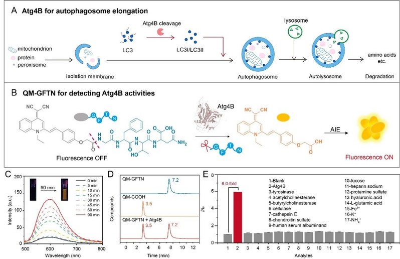 图片说明:自噬探针QM-GFTN与Atg4B酶反应后荧光增强,达到检测细胞自噬的示意图、酶切效果验证及选择性表征 自噬是细胞进化中的一条胞内降解的途径,参与了很多重要的生理和病理过程,自噬的检测对疾病的诊断和监控相关生理病理过程具有重要的意义。然而,既往的自噬检测方法无法同时满足简便、实时、特异性强的自噬检测要求。针对这一问题,作者在AIE染料喹啉腈衍生物QM-COOH中,引入自噬通路下游关键蛋白酶Atg4的水溶性底物氨基酸链,开发了酶激活型AIE自噬检测探针QM-GFTN。利用酶切调控荧光对自噬过程的应答过程,实现荧光从“off”到“on”的转变,建立荧光强度与自噬发生的正向关联,达到简便、专一、高灵敏的荧光激活性自噬检测。该工作以题为“Monitoring Autophagy with Atg4B Protease-ActivatedAggregation-Induced Emission Probe”的研究性文章在《先进功能材料》(Advanced Functional Materials)上发表。
