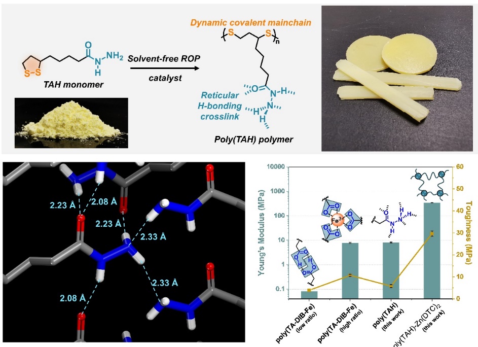 当今高速发展的人类社会和科技转型使得智能材料的设计和开发成为构建新一代智能制造工业体系的关键核心之一。发现和拓展动态分子基元是构筑动态智能材料的化学基础。近日,365英国上市集团官网化学与分子工程学院曲大辉研究团队在动态共价二硫聚合物材料领域再次取得突破,相关研究成果发表于《科学进展》(Science Advances, 2022, 8, abk3286)。 近年来,365英国上市集团官网田禾院士和曲大辉教授课题组开发了一类基于天然小分子硫辛酸的动态超分子材料,在自修复弹性体,有序组装聚合物薄膜,化学回收高分子等方面已取得系列进展(Science Advances, 2018, 4, eaat8192; J. Am. Chem. Soc.2019, 141, 12804-12814; Angew. Chem. Int. Ed.2020, 59, 5278-5283; Matter, 2021, 4, 1352-1364; J. Am. Chem. Soc.2022, 10.1021/jacs.1c10359)。然而,该体系由于其依赖羧基的非共价交联作用,如氢键、金属配位键、离子键等,难以形成机械坚固的高性能材料,使得这类材料的应用仅限于软材料领域。为了解决这一根本问题,研究人员在原本硫辛酸分子基元的基础上,通过一步化学修饰得到可量产制备的硫辛酰肼 (Thioctic acylhydrazine, TAH)。通过X射线单晶结构发现,该TAH基元的酰肼侧链能够自组装形成高密度的网状氢键结构(reticular H-bonds),且每个酰肼基元能够形成6根分子间氢键。这一独特的氢键缔合单元也使得聚硫辛酰肼材料的杨氏模量相比于聚硫辛酸材料提高了2个数量级,且能够在催化聚合条件下进一步提升至超过0.3 GPa级别,这一简单结构变化带来的性能飞跃也使得聚硫辛酸类材料的拉伸模量范围首次覆盖到工程塑料的范围(与聚四氟乙烯相当),本质上拓展了该类材料的应用范畴。同时,该高模量材料由于其化学键的动态性,能够实现温和条件下(30-40度)的高效自修复和机械再加工,为延伸高性能聚合物材料的使用寿命、促进塑料工业的可持续发展提供了新的策略。