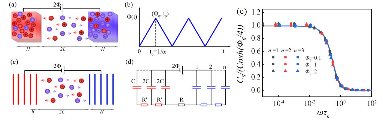 (a) 带电超级电容器示意图。(b)CV实验中的外加电压示意图。(c)堆叠电极模型示意图 (的)堆叠电极模型的等效电子电路。(f) 表面积分电容与无量纲组合的关系示意图。 在电化学实验中,循环伏安测试(CV)常用于分析EDLs的电化学性能。然而,CV数据与电极材料结构之间的关系并不明了。多年以来,研究者们使用RC串联电路、传输线模型、有限元方法等理论方法,对CV展开了深入研究。然而CV与电化学器件微观性能参数之间的定量关系仍然缺乏。 针对这一问题,作者团队将电极结构近似为一系列无限薄的平行板堆叠而成,使用等效电路模型和Poisson–Nernst–Planck方程和分别研究多孔电极宏观动力学和纳微观尺度的电解液热力学与动力学。研究发现,由外加电压扫描频率和堆叠电极模型的弛豫时间组成的无量纲组合为CV曲线和表面积分电容的决定参数:当时,CV曲线由双电层限制,而当时,CV曲线由扩散限制,其中弛豫时间的表达式为: