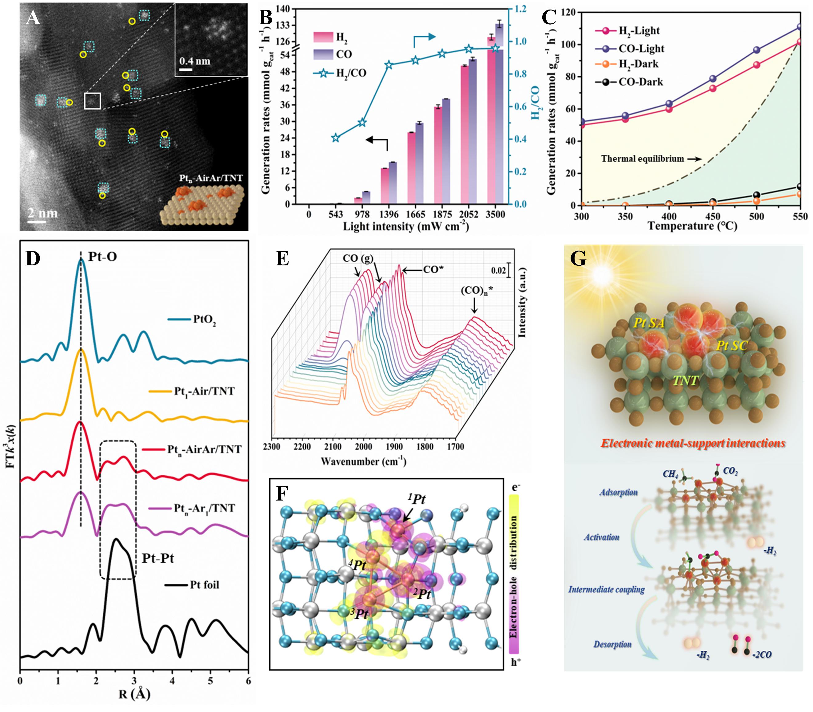 基于上述背景,张金龙教授团队运用离子交换和空间限域策略,对TiO2纳米管上的Pt位点进行原子级调控,诱导局部电荷重排,促进了反应物分子在活性位点的定向吸附与活化,在光驱动下实现了高效稳定的甲烷干重整。其中,该团队构筑的Pt单原子 (SA) 和Pt亚纳米团簇 (SC) 共修饰样品Ptn-AirAr/TNT(图A),在光驱动DRM反应中表现出高达34.41 mol gPt-1 h-1的合成气生成速率和接近1:1的H2/CO,打破了传统热催化的局限性(图B-C)。该研究凭借X射线吸收光谱(XAFS)、原位红外漫反射光谱(DRIFTS)及激发态计算等先进表征手段,深入解析了不同Pt位点修饰样品中电子-金属-载体之间的相互作用(图D-F)。研究表明,单原子和团簇的特殊结构所诱导的界面电荷重排和电子金属-载体相互作用增强了反应物及中间体转化,Pt SA与Pt SC合适的距离促进了C=O偶联,有效抑制了副反应,促进了H2和CO的高效稳定生成(图G)。该工作阐明了活性位点与界面态调控在DRM反应中的重要作用,为在原子尺度上探究多分子反应体系提供了指导。