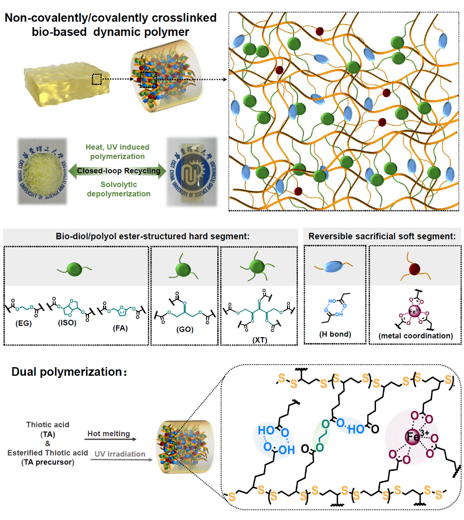 近日,365英国上市集团官网化学与分子工程学院费林加诺贝尔奖科学家联合研究中心曲大辉教授团队在探索可回收二硫材料领域研究取得新进展,相关成果以“Closed-Loop Recyclable Poly(ester-disulfide)s for Potential Alternatives to Engineering Plastic ”为题发表于Angewandte Chemie International Edition. 随着塑料制品需求的快速上涨,随之而来的能源危机、气候变暖加速了塑料循环经济的研究。物理回收、生物降解等常见回收手段都面临着不同的技术瓶颈,如性能损耗显著、降解条件严苛等。相较而言,化学回收是最有可能实现塑料普适闭环回收的手段之一。与此同时,采用动态共价聚合物替代传统碳氢聚合物可在保留材料优异耐化学性、高机械强度的同时轻松实现高效闭环回收。 该研究团队以聚硫辛酸为研究对象,通过将传统生物基聚酯中的刚性结构单元多元醇引入聚合单体硫辛酸侧链,构建了一种基于非共价/共价协同交联的生物基聚二硫化物。所制备的动态聚二硫化物由基于生物基刚性多元醇的硫辛酸多元酯聚合前驱体与硫辛酸共聚而成,并辅以掺杂式非共价交联剂金属铁离子。其因所含刚性多元酯与柔性二硫组分的精准可调控而具备了良好的热稳定性、广谱可调的机械强韧性以及优异的耐化学性。该动态聚合物采用微量有机酸催化法,在温和条件下实现了高效的闭环回收,且性能鲜有下降。该工作为现有大规模生产的化石工程塑料制备提供了一种绿色可持续的替代方案,且对当今工业可持续化发展有着重要意义。