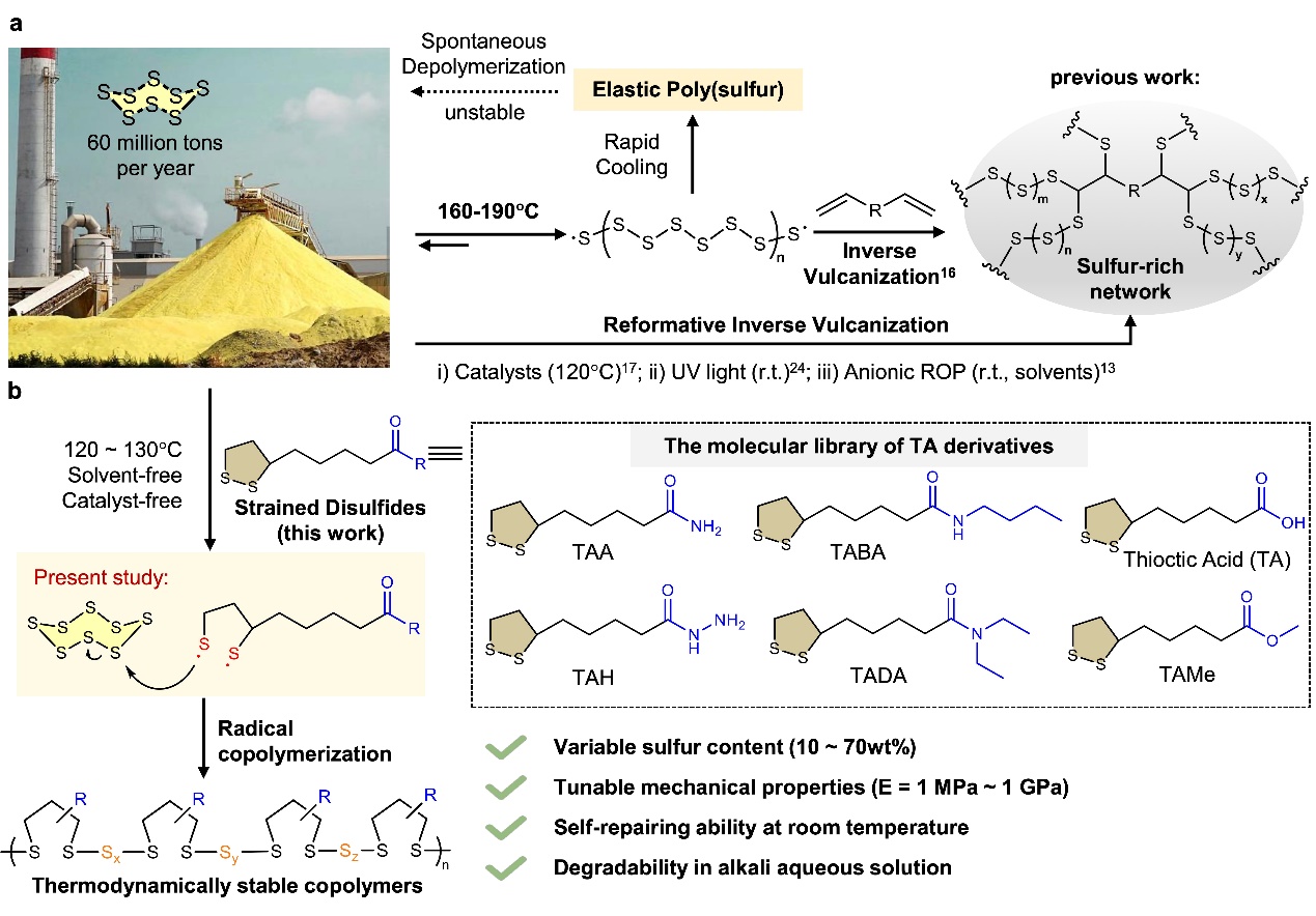 近日,365英国上市集团官网化学与分子工程学院费林加诺贝尔奖科学家联合研究中心曲大辉教授课题组在Nature Communications上发表了题为Converting inorganic sulfur into degradable thermoplastics and adhesives by copolymerization with cyclic disulfides的研究论文,在线报道了团队在动态二硫聚合物研究新进展。 硫是地球上储存量排名第五的元素,八元环状硫单质具有独特的结构与化学稳定性,广泛分布于自然界中。随着石油工业的发展,作为石油化工下游产物的单质硫产量逐年上升,现如今已达到6000万吨/年。目前单质硫的消耗量与产量严重不匹配,单质硫常作为橡胶工业中的橡胶硫化剂使用,但年消耗量有限。因此以单质硫为原料制备生产具有经济价值与实际应用的商品,尤其是塑料,具有重要的意义。通过“逆硫化”反应,即高温条件下单质硫与烯烃分子发生共价交联反应,可获得一系列共价交联聚合物材料,但该类反应往往需要引入金属催化剂、光照条件或者阴离子诱导聚合等手段,经济效益较低且力学性能无法满足实际应用。除此之外,单一的共价开环聚合反应不能得到具有力学性能和实际应用价值的高分子材料,这是由于聚硫高分子在热力学上不稳定,平衡倾向自发形成单质硫单体。 为了解决这一实际问题,团队人员引入五元环二硫作为共聚物,促进八元环单质硫热力学稳定开环聚合,同时利用超分子侧链交联策略,开发了一系列硫含量可调控(10 ~70 wt%)、机械性能广谱可调的富硫超分子材料。作者通过引入具有不同策略官能团的五元环二硫共聚单体,获得了一系列热力学稳定的富硫超分子材料,通过调控侧链超分子交联密度,实现将富硫超分子材料的应用范畴覆盖至软弹性体材料(杨氏模量1 ~8 MPa)、硬弹性体材料(杨氏模量60 ~210 MPa)以及强韧塑料(杨氏模量220 ~950 MPa)。由于侧链的氢键交联的动态可逆性,该富硫超分子材料展现出室温自修复性能和良好的再加工性能,所制备的纤维材料展现出良好的可拉伸性和韧性,杨氏模量可达0.8 GPa。相较于此前基于单质硫的聚合物材料,本工作所获得的材料性能得到了显著的提升。