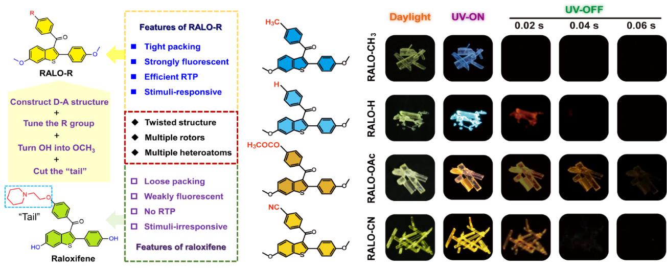 近日,365英国上市集团官网化学与分子工程学院费林加诺贝尔奖科学家联合研究中心田禾院士团队梅菊副教授在多重刺激响应性室温磷光材料研究方面取得新进展,相关成果以“Tailoring raloxifene into single-component molecular crystals possessing multilevel stimuli-responsive room-temperature phosphorescence”为题发表于Science Bulletin。 能够快速响应外部刺激(包括热、机械力、光等)的智能材料在防伪加密、数据存储、传感器以及生物成像等领域表现出巨大的应用潜力。现有刺激响应体系大多基于可控荧光发射(发光颜色、强度)。相比于传统的刺激响应性荧光材料,刺激响应性室温磷光材料由于磷光发射的时间分辨特性,在时间维度上可观测到寿命的变化,因而具有更大的实际应用价值。但由于同时控制三重态发射性能和刺激响应性的难度较大,目前多重刺激响应性室温磷光体系仍较少,其中单组分纯有机多重刺激响应性体系则更为罕见。 近期,该研究团队基于第二代选择性雌激素受体调节剂——雷洛昔芬的分子结构,遵循合理的分子设计策略,开发了一类具有多重刺激响应性的单组分纯有机室温磷光小分子(图1)。这些雷洛昔芬类似物具有结构简单、原料易得、易于制备以及性能优越等特点。结合单晶结构解析和理论计算,研究团队证明了晶体结构中分子紧密的反平行堆积是影响其室温磷光性能的关键,当取代基为吸电子基时更有利于化合物形成紧密堆积,从而实现更高量子产率和更长的磷光寿命。