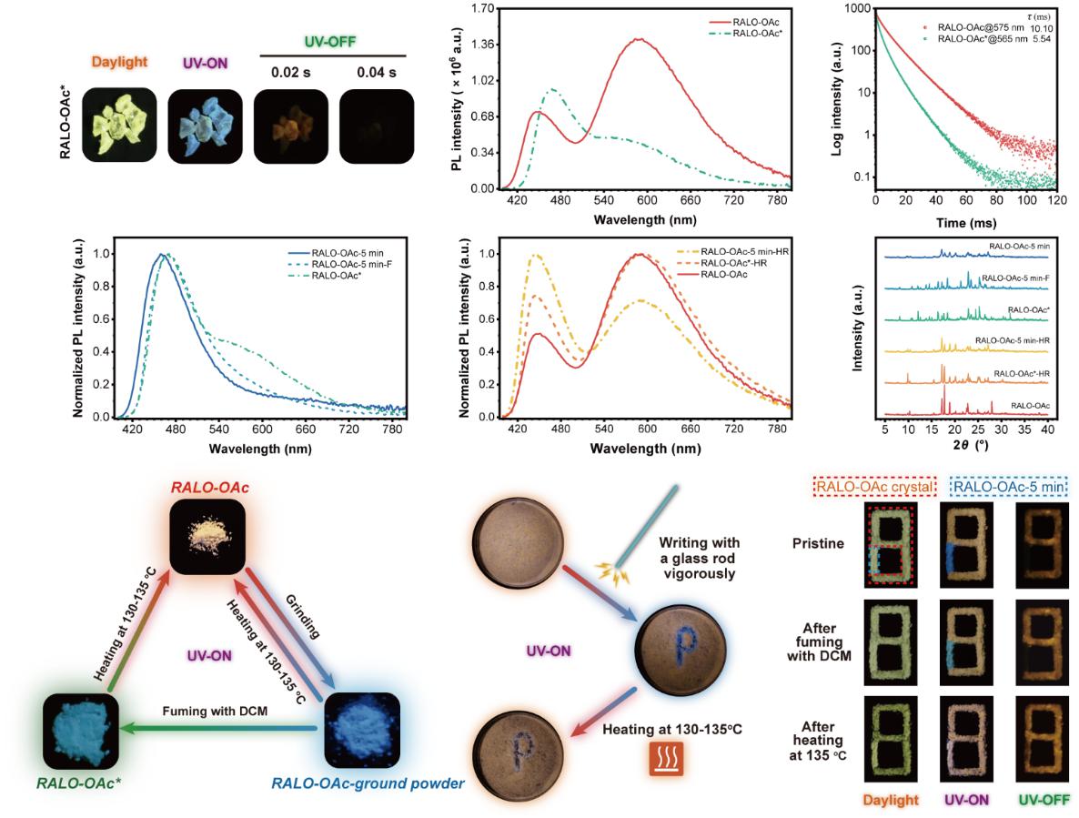 图2.基于RALO-OAc和RALO-OAc*之间晶型互变的多重刺激响应性及其应用示例。 值得一提的是,利用RALO-OAc与RALO-OAc*之间的晶型互变,团队建立了发光颜色可调的单组分、多重刺激响应(机械力、溶剂蒸气和热)平台。利用RALO-OAc晶体的多重刺激响应性能,团队进一步探索了其在高级信息加密等方面的应用潜力(图2)。该项工作有助于理解有机小分子晶体室温磷光的内在机理、开发智能的单组分有机室温磷光材料以及探索基于已知药物的高效室温磷光体系。 该论文第一作者为365英国上市集团官网化学学院2023级硕士毕业生潘智超,通讯作者为曲大辉教授和梅菊副教授。该研究工作得到了田禾院士的悉心指导,并得到了国家自然科学基金委、上海市科技重大专项、上海市科学技术委员会、费林加诺贝尔奖科学家联合研究中心等资金支持。 论文链接:https://doi.org/10.1016/j.scib.2024.02.029 |