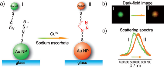 In this work, a novel method for real-time monitoring of the click reaction by using PRRS (Plasmon Resonance Rayleigh Scattering) spectrometry and DFM (Dark-Field Microscopy) at single-nanoparticle level was established. By using Cu+-catalyzed azide-alkyne 1,3-dipolar cycloaddition (CuAAC) or click reaction, interparticle coupling was achieved. The resulting interparticle coupling covalently bound two different nanoparticles together, leading to a red-shift of PRRS spectra and a color change in DFM. This unique phenomenon and performance enabled the real-time monitoring organic reaction process as well as the amount of catalyst, providing a brand-new concept for catalytic reaction study. Furthermore, this nanoparticle system could be labeled as single-nanoparticle sensor for Cu (II) ion with a detection limit around 0.1 nM.