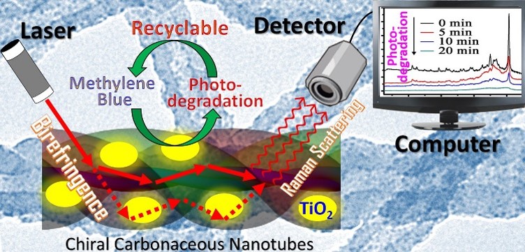 Here, the chiral CNT was firstly and successfully used in the plasmon-free SERS detection, and the TiO2 modification on the CNT realized the recycle of SERS substrate. The high SERS sensitive detection over the chiral CNT/TiO2 hybrid was achieved owing to the occurrence of birefringence induced by the unique helical structure. The highly dispersed TiO2 nanocrystals on the surface and inside the cavity of CNTs can completely degrade the detected organic pollutants under the solar light irradiation, which contributes to the recycle of the SERS substrate. The present investigation not only expands the application of chiral inorganic materials in the SERS, but also provides a new substrate materials used in the plasmon-free SERS detection.