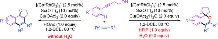 Transition-metal-catalyzed cascade transformations of alkynols have attracted extensive interest because they enable the highly efficient synthesis of oxygen-containing heterocyclic compounds, including natural products and drugs. However, most of these reactions were catalyzed by the transition metal catalysts such as tungsten, gold, platinum, palladium, and copper catalysts and involve intramolecular cycloisomerization of alkynols together with diverse transformations, such as a Prins-type cyclization, Diels-Alder reaction, or Povarov reaction. This work successfully developed two tunable cascade reactions of alkynols with alkynes by merging Sc(OTf)3 and rhodium catalysis. In the absence of H2O, an endo-cycloisomerization/C-H activation cascade reaction provided 2,3-dihydronaphtho[1,2-b]furans in good to high yields. In the presence of H2O, the product of alkynol hydration underwent an addition/C-H activation cascade reaction with an alkyne, which led to the formation of 4,5-dihydro-3H-spiro[furan-2,1’-isochromene] derivatives in good yields under mild reaction conditions. Mechanistic studies of the cascade reactions indicated that the rate-determining step involves C-H bond cleavage and that the hydration of the alkynol plays a key role in switching between the two reaction pathways.