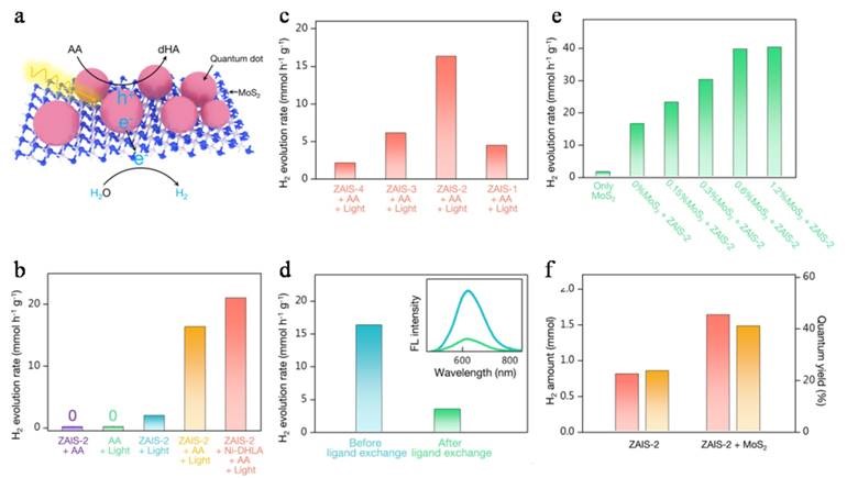 In the present work, the authors synthesized one kind of Zn-Ag-In-S quantum dots (ZAIS QDs) with high quantum yield. The stability of these ZAIS QDs was improved by using glutathione as the ligand and the surface defects were reduced by controlling the cation components. More importantly, the efficient hole-electron separation was realized by formation of the QDs-MoS2 composition. As a result, the hydrogen generation is reached up to 40.1mmol·h-1·g-1 under simulated solar illumination. The combination of QDs and 2D nanosheet combines the strong light harvesting capability of QDs with the excellent catalytic performance of 2D nanosheets. This work presents a platform for the construction of high-efficiency photocatalytic systems for hydrogen generation that could potentially be extended toward carbon dioxide reduction and oxygen evolution.