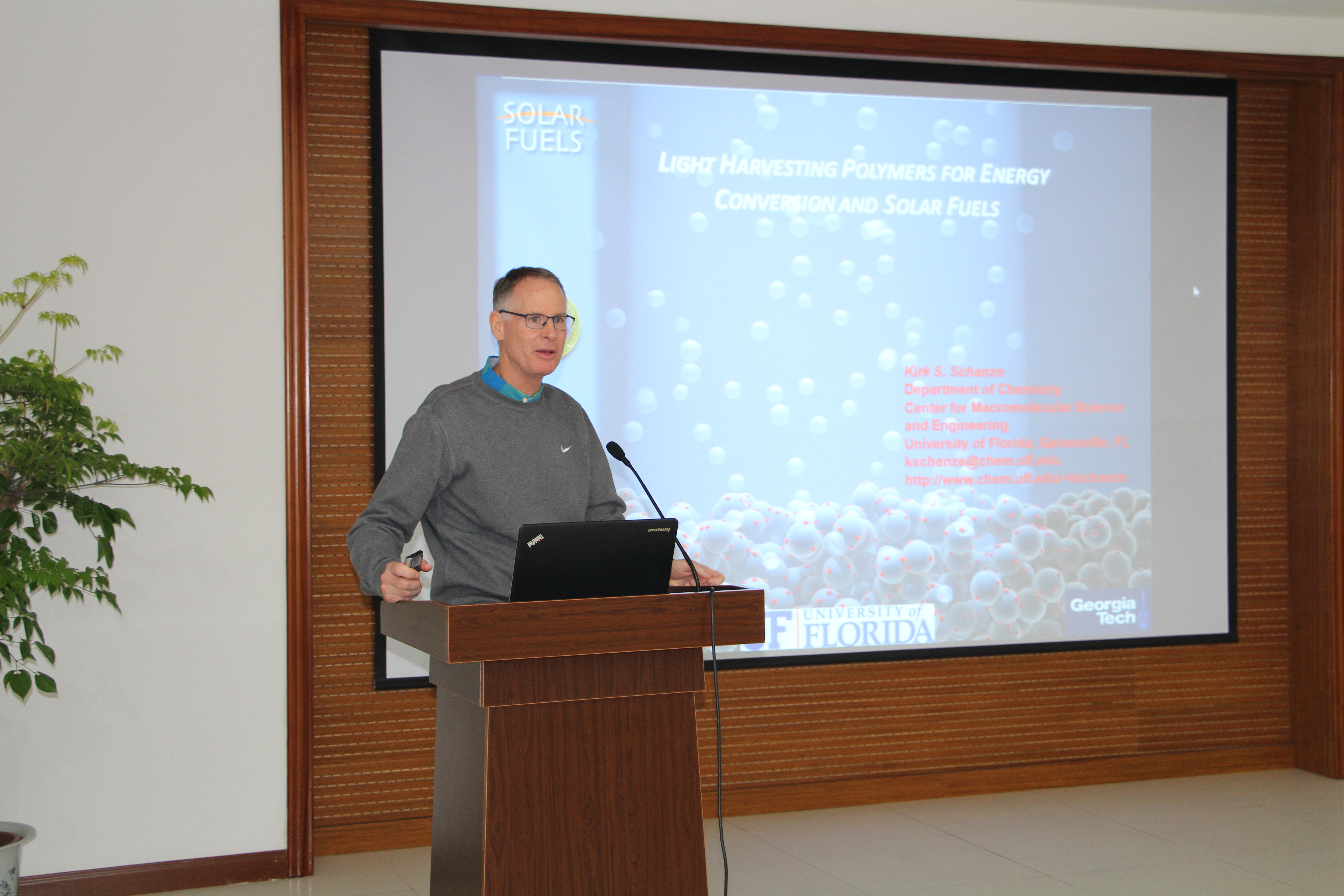 Kirk S. Schanze教授从介绍太阳能燃料的新策略开始,阐述了设计和表征太阳能材料的理论和方法。多年来,他致力于研究光对小分子、聚合物以及材料的影响,成功模拟了分子吸收光子后产生的物理和化学过程。目前,他的课题组通过使用荧光光谱、激光诱导时间分辨荧光光谱等不同的光谱技术,重点探索研究物质的光现象,并从中获知光的吸收和发射机理。这些工作正在逐步扩展到实际应用当中,包括利用分子和材料的发光过程制作新型的聚合物LED和荧光传感器;部分传感系统已经应用于空气动力学研究和分子检测。