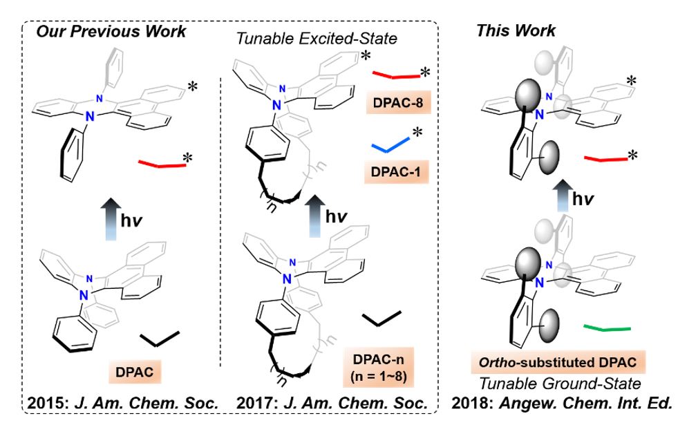 近年来,苏建华教授和田禾院士团队在有机共轭分子发光新机制方面做了一系列开创性的工作(图1所示)。2015年,他们首次设计并合成了马鞍形的N,N’-二取代-二氢二苯并[a,c]吩嗪类化合物,发现这类化合物具有极大的Stokes位移及多重发射的光物理现象,并提出了“振动诱导发光(Vibration Induced Emission, VIE)”来解释这一特殊的发光现象(Chem. Commun. 2015, 51, 4462)。与台湾大学周必泰教授合作,运用稳态和瞬态光谱,结合理论计算,详细阐述了VIE机制的激发态平面化过程(J. Am. Chem. Soc., 2015, 137, 8509)。2017年,他们将二氢二苯并吩嗪类化合物进行分子内环化,实现了控制该类分子的VIE过程,成功地将分子发光由蓝色调控至红色;并与周必泰教授合作,通过超快光谱以及理论计算,再一次证明了VIE的发光机制(J. Am. Chem. Soc.,2017, 139, 1636)。操控VIE激发态过程的成功实现,促使他们进一步思考如何通过化学手段调控二氢吩嗪类分子基态的构像,从而模拟VIE激发态平面化过程。