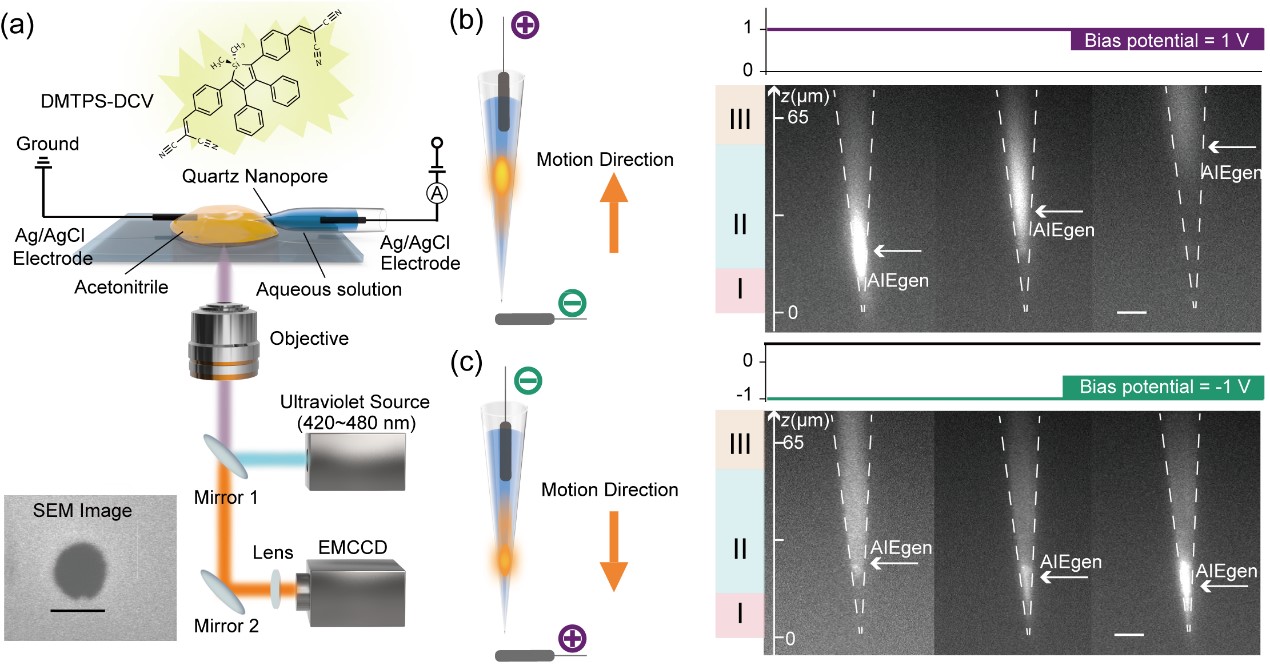 该研究团队利用前期提出的纳米孔电化学限域测量思想,针对聚集诱导发光体(AIEgens)发光过程可逆操控这一挑战,探索制备了单个石英纳米孔道限域光电传感界面,直接对纳米孔尖端限域空间内飞升量级AIEgens溶液进行电化学可逆调控,使得AIE发光体在限域尖端和非限域空间之间以1.4 μm/s-2.2 μm/s的速度往复运动,从而在单分子水平上实现了动态聚集诱导发光过程的动态可逆操控。同时,利用瞬态电化学-荧光联用技术,实时同步的监测了聚集诱导发光体在限域空间可逆变化过程。进一步,研究团队利用光电纳米孔道高空间分辨的特性,将AIEgens电化学可控地注入到单个细胞中,应用于非水溶性AIEgens分子的单个活细胞荧光成像分析。该研究为构建具有良好可逆性和可重复性AIEgens传感测量机制提供了新思路。