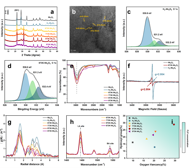 构建高密度FLP的难点在于形成大量空间相邻但未猝灭、且表面浓度相当的路易斯酸(LA)和路易斯碱(LB)位点。鉴于此,近日,该团队进一步利用热还原促进相变策略在Nb2O5上构建了由空间上被氧空位分隔(Vo)的低价Nb(LA 位点)和Nb-OH(LB位点)组成的高密度FLP位点。通过实验与理论计算的结合揭示了Nb2O5上光增强的FLP位点具有高C-H键活化效率。同时,层状Nb2O5表面平坦的原子排布降低了活性位点吸附甲烷分子的空间位阻,结合高密度的FLP位点,达到了1456 μmol g-1 h-1的高甲烷转化率。该研究阐明了基于固体FLP的甲烷C-H键极化位点的设计原理,深入解析了光激发下活性位点的增强机制,为无贵金属辅助的高效甲烷转化光催化剂的结构设计提供了新的视角。