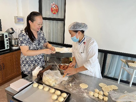 活动前,学院工会特地为大家精心准备好面团、馅料、手套、模具等材料。在老师的讲解演示下,大家迫不及待开始动手制作,揉皮、加馅、包月饼、放入模具按压成型,现场气氛温馨热闹。经过两个多小时的制作,一盒盒漂亮的冰皮月饼就制作完成了,活动现场弥漫着南瓜豆沙、蜜枣红芋的香甜味道。还有教师尝试挑战更高阶版的鲜肉月饼,纯猪肉制作、不添加味精与色素的鲜肉月饼香嫩不腻,表皮金黄酥脆,馅料十足多汁,一口下去,满满的幸福感。