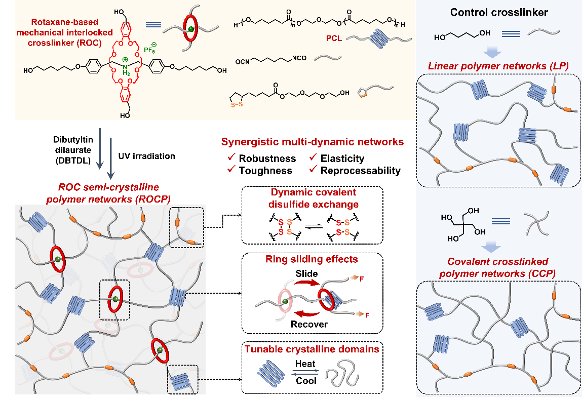 近期,曲大辉教授课题通过利用机械互锁策略构建了新型高性能弹性体。在此项研究中,机械化学被整合到了线性半结晶网络中,实现了看似冲突的材料特性的同步提升,包括机械鲁棒性、韧性和弹性。具体来说,研究者构建了一个机械互锁的半结晶网络,包括以二硫键封端的PCL线性骨架和作为机械互锁交联位点的[2]轮烷。聚合物网络优异的机械鲁棒性和韧性归因于机械互锁交联、PCL结晶域作为物理交联和二硫动态交联的协同作用。流变学测试和全原子分子动力学模拟表明,穿过筛状大环的结晶畴的解离给聚合物网络带来了优异的能量耗散机制。值得注意的是,可逆的纳米晶域和环滑效应加速了链段运动,有效地减少了能量耗散,从而促进了非晶聚合物基体中柔性链段的弹性收缩,从而获得瞬时弹性。此外,快速的二硫键交换使所得聚合物在温和条件下具有可再加工性,同时保持良好的机械性能。进一步研究了这种高性能弹性体作为光热致动器的应用潜力。这种机械互锁结构和传统半结晶聚合物的巧妙结合可以推动机械键合化学朝着高性能聚合物材料的高级应用迈出重要一步。