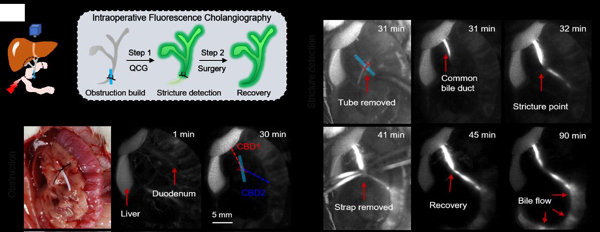 基于蛋白质测序结合透射电子显微镜分析进一步揭示,胆汁中的血红蛋白亚基能够特异性驱动初始片状喹啉菁纳米聚集体发生重构,转变为形貌均一、结构稳定的球形蛋白-染料复合聚集体,并实现在1011nm处高达310的荧光显著增强。基于喹啉菁探针对胆汁的选择性激活特性,研究团队首次在活体水平实现了肝内胆管结构的清晰可视化,并进一步展现出高对比度、精准的胆管造影能力,涵盖胆道树整体描绘、狭窄部位识别、胆汁渗漏实时检测以及双色肝胆成像等多种关键术中应用场景。该靶标蛋白触发的原位重组装策略为可激活近红外二区荧光探针提供了具有普适性的分子设计范式,为荧光引导手术分子工具箱的拓展奠定了重要基础。