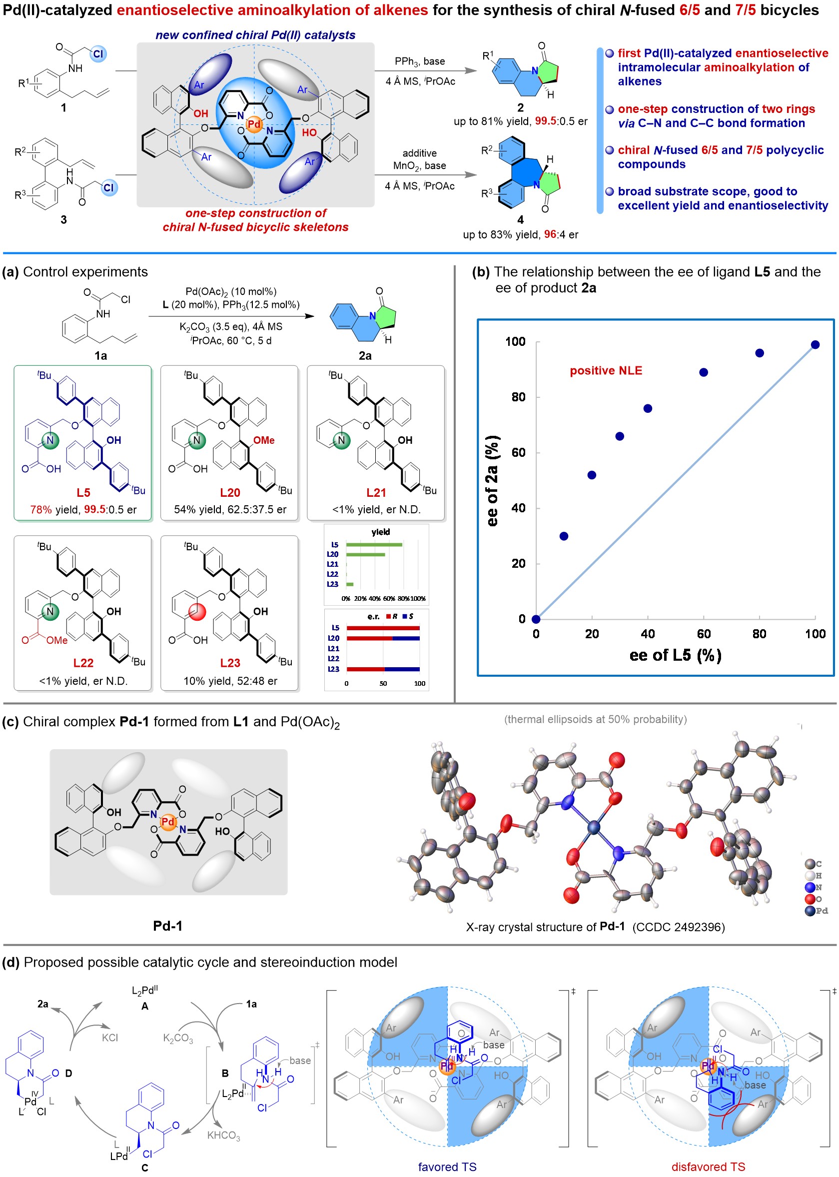 365英国上市集团官网张志鹏教授/岑守义老师团队以不对称催化和手性分子的合成为主要研究方向,长期致力于新型原创性手性催化剂的设计、发展和应用研究。为了发展高效合成含有手性N-稠合6/5和7/5双环骨架的多环化合物的新方法,该团队设计发展了一种新型的具有紧密手性环境的二价钯催化剂,该催化剂由两个含有联萘结构的轴手性吡啶甲酸配体与一个二价钯离子配位形成,利用该催化剂首次实现了非活化烯烃的对映选择性分子内胺化烷基化反应,通过一步反应同时构建了C−N键和C−C键,以中等至良好的收率和优异的对映体选择性(高达99.5:0.5 er)成功合成了多种含有手性N-稠合6/5或7/5双环骨架的多环化合物。该工作不仅为相关的N-稠合多环化合物的合成提供了一种有效的方法,也对新手性催化剂的设计发展有一定的启示作用。
