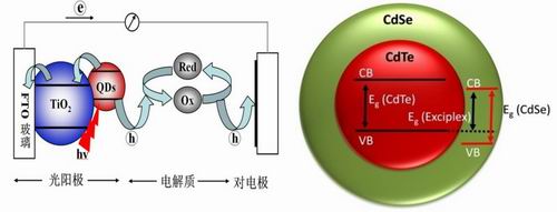 In this research work, the research group for the first time use the Type-II core/shell structure quantum dots as composite excited state to on one hand extend the absorption region to near-infrared zone, while on another hand achieve the separation of electrons and holes, benefiting the electron injection and transmission. This work combines the after-synthesis quantum dots deposition technology, eventually raises the QDSC efficiency to a new high-level and meanwhile makes the sensitized cells with liquid junction comparable to other complex-configurated cells in cell efficiency.